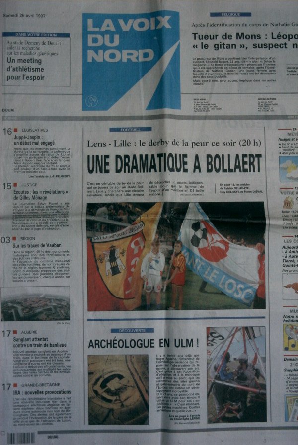 Cette photo est tirée du journal quotidien du nord pas-de-calais: 'La voix du nord'. Me voila en photo à la Une de ce journal! Je suis celui qui porte le maillot lensois.